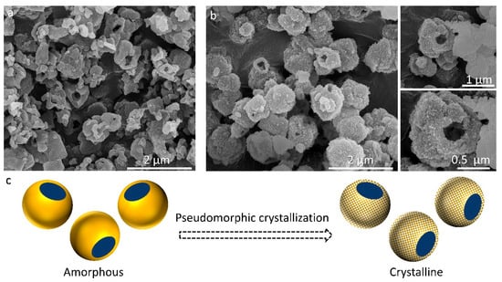 Surprisingly, the IZT performed for 11 d resulted in hollow submicron particles composed of nanoparticles resembling the amorphous particles obtained after 1 d of synthesis (Figure 6a,b). This observation represents a crystallization that involves a pseudomorphic transformation of an amorphous phase (Figure 6c). This suggestion is also supported by the PXRD pattern (Figure 1a) where the peaks of EDI zeolite coexist with an amorphous hump. Another conclusion of this observation is that the nucleation and the crystallization of EDI particles occurs within an amorphous phase by mimicking the pre-existing morphology. Although a recent example has shown the crystallization of hierarchical BEA zeolite from FAU zeolite using OSDAs [], to the best of our knowledge, hierarchical structures of zeolites obtained via pseudomorphic crystallization during IZT have never been reported. It is important to note that the hierarchical structure here describes the organization of particles, not of porosity. A comparison of the hollow particles to other EDI morphologies obtained under varying time and temperature conditions (Figure 5) reveals that various metastable morphologies exist within the IZT.