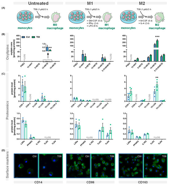 Effect of the LXR agonist T09 on the ARA cascade and differentiation of primary macrophages. (A) Primary human blood monocytic cells were treated with 10 ng/mL GM-CSF (M1 type) for 8 days or with M-CSF (M2 type) for 8 days, as well as 10 ng/mL IFNγ (M1 type) or IL-4 (M2 type) for the final 2 days. Additionally, M1 cells were challenged with 100 ng/mL LPS for 6 h. For the untreated macrophages, the adhered monocytes were left untreated for 8 days. The three different macrophage phenotypes were incubated with (blue) or without the synthetic LXR agonist T09 (1 µM; green) for the final three hours. Shown are (B) oxylipin concentrations and (C) protein levels (mean ± SEM; cells from 3–5 donors). (D) The three macrophage phenotypes with or without T09 (1 µM) were immunostained for specific macrophage markers CD14 (untreated), CD86 (M1), or CD163 (M2) using specific mouse anti-human antibodies (green) (magnification 63×). Nuclei were counterstained with Hoechst (blue). The immuno-positivity of the antibodies towards the respective macrophage types is shown in Figure S1. Differences were considered significant at p-values < 0.05 (**) or < 0.01 (***) using a two-tailed, unpaired student’s t-test.