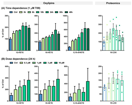 (A) Time- and (B) dose-dependent T09-induced 15-LOX abundance and activity in primary M2-like macrophages. Shown is the increase of ARA-derived 15-LOX metabolites 12-HETE, 15-HETE, and 5,15-diHETE (left) and 15-LOX abundance (right). Results are shown as % of Ctrl (mean ± SEM, cells from 3–5 donors).