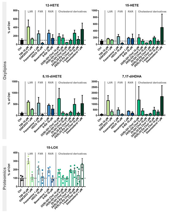 Following the evaluation of the optimal incubation conditions, the induction of 15-LOX by other LXR-, FXR-, and RXR-specific compounds as well as cholesterol derivatives (Figure 4) was investigated. The results are shown in Figure 5 and Table S4.