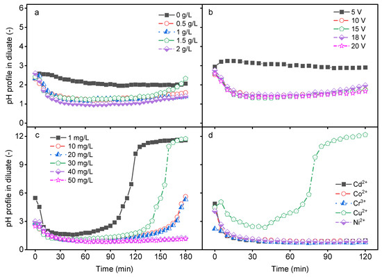 (a) Impact of ionic strength (NaCl) on pH in the diluate as a function of time. (b) Impact of electrical potential on pH in the diluate as a function of time. (c) Impact of the concentration of each HM on pH in the diluate as a function of time. (d) Impact of the type of HM on pH in the diluate as a function of time.