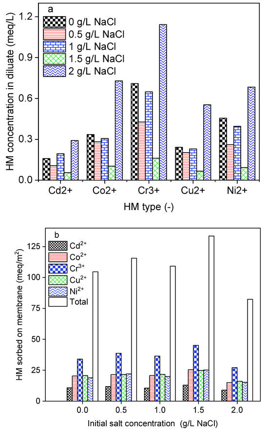 In a natural environment, HMs are found in water resources with different ionic strength backgrounds. To create feed water solutions with various ionic strengths, 50 mg/L of each HM was prepared in 0; 1; 1.5, and 2 g/L NaCl solutions. During this investigation, DS-BMED was set at a constant applied electrical potential of 15 V and the process was run for 180 min. As shown in Figure 2a, HMs in the diluate decreased with salt concentration up to 1.5 g/L of NaCl, which resulted in high removal efficiency. At a salt concentration higher than 1.5 g/L, HMs in the diluate increased sharply. The feed solution containing 1.5 g/L NaCl was found to achieve removal efficiencies higher than 95% for HM. A large portion of the removed HMs was sorbed onto the membranes, as shown in Figure 2b. In contrast to conventional ED, DS-BMED cannot be evaluated based on the EC removal efficiency. The novel process was designed in such a way that in desalting (diluate) channels, the production of H+ and OH− from water splitting in BM can maintain a higher EC and consequently reduce the solution resistance. The ionic strength promoted the current flow and prevented water ions from spitting, maintaining it at a higher level. A higher current flow until the end of the process is evidence of the mitigation of the overall stack resistance. In conventional electromembrane-based processes, the current flow declines gradually and this behavior testifies to the increase in stack resistance over time [35]. The H+ and OH− contributed in three ways to ensure higher HM removal efficiencies: (i) converting neutral forms of HMs into ionic forms, (ii) reducing the overall stack resistance, and (iii) avoiding multivalent cation precipitation on cation exchange membranes in the process.