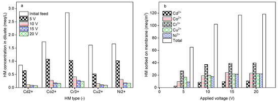 (a) HMs in the diluate at the end of the experiment as a function of the applied potential. (b) HMs sorbed onto the membrane as a function of the applied electrical potential.