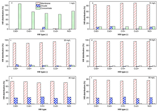 Groundwater and/or surface waters and various industrial effluents contaminated with HMs are typically related to human activities, such as industrial processes, electric energy generation, mining, and fuel production. The type of HM in the water depends on the activities being run directly in the surrounding areas. Contaminants can be indirectly transported to water bodies far from other polluted zones. Therefore, it is important to evaluate how each type of HM can be removed by DS-BMED. DS-BMED set at a constant voltage of 15 V was applied to a solution containing 1.5 g/L of NaCl and an initial concentration of 50 mg/L for each HM (Cd2+, Co2+, Cr3+, Cu2+, and, Ni2+). This process was run for 120 min. According to the data shown in Figure 4a–f, the distributions of HMs between the diluate, membranes, and concentrate at the end of the experiment reveal that Cu2+ was highly removed HM, with a removal efficiency of 98%. The lowest removal efficiency was 55% for Cr3+. The removal efficiencies of these HMs were in the following order: Cu2+ ˃ Cd2+ ˃ Co2+ ˃ Ni2+ ˃ Cr3+. Looking at the mechanistic explanation of this rejection order, it seems that neither the ion size, valence, nor their hydration energies can explain it. Both factors act synergistically to contribute to the rejection in different proportions. As can be seen in Table 1, Cu2+ was the only HM with a lower percentage of neutral form than the others, especially at basic pH (only 11% of Cu2+ was in the form of Cu(OH)2 (aq)). This factor should be the main reason for the higher removal performance of Cu2+. The other HMs revealed a higher percentage of their neutral forms in the same base region of pH, leading to lower/no mobility of the HM in the basic channels.