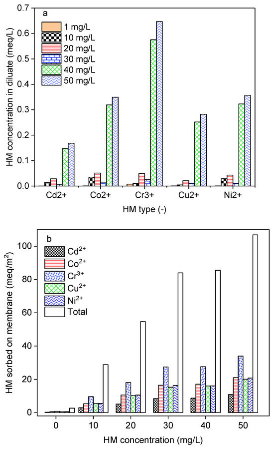 (a) HMs in the diluate at the end of the experiment as a function of the initial concentration of each HM. (b) HMs sorbed onto membranes as a function of the initial concentration of each HM.