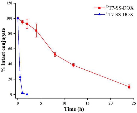 It is noteworthy that the degradations of DT7-SS-DOX in both 5 mM and 5 μM GSH were slower than that of LT7-SS-DOX. In 5 mM GSH mimicking the tumor cell reductive microenvironment (2–10 mM GSH) [27], the DT7-SS-DOX conjugate showed 50% degradation in approximately 2 h (t1/2 = 1.93 ± 0.13 h), which was almost 8 times longer than that of LT7-SS-DOX (t1/2 = 0.26 ± 0.01 h), demonstrating that DT7-SS-DOX had a sustained drug release manner which might help to exert the antitumor effect for a longer time. When incubated in 5 μM GSH, DT7-SS-DOX was more stable than LT7-SS-DOX during the incubation period of 24 h (Figure 2A,B), which might result in higher stability, less drug release, and toxicity of DT7-SS-DOX in normal physiological condition.