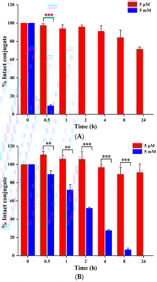 Reduction-triggered degradation of LT7-SS-DOX (A) and DT7-SS-DOX (B) by GSH. Data were expressed as mean ± SD (n = 3), ** p < 0.01 and *** p < 0.001.