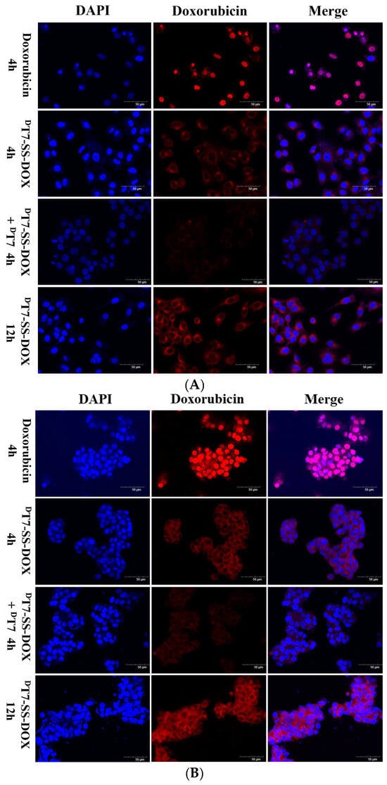 When incubated with drugs for 4 h, the fluorescence intensity in the same kind of tumor cells ranking from the highest to the lowest was free DOX, DT7-SS-DOX, and LT7-SS-DOX (Figure 3A–C and Figure 4). This phenomenon is probably due to the fast passive diffusion of free DOX into cells without a drug release process, whereas the entry of the conjugates into cells via TfR-mediated endocytosis was a relatively slow process. Meanwhile, the binding affinity of DT7 to TfR is higher than that of LT7, so DT7-SS-DOX could bring more drugs into tumor cells via the TfR-mediated endocytosis pathway during the same incubation period. In addition, the fluorescence intensity of both LT7-SS-DOX and DT7-SS-DOX in tumor cells increased with the prolongation of incubation time (Figure 3A–C and Figure 4, 4 h versus 12 h), demonstrating that the TfR-mediated endocytosis of PDCs and the subsequent cleavage of the disulfide bond by GSH to generate DOX-SH (Scheme 1) was a gradually cumulative process which was time-dependent.