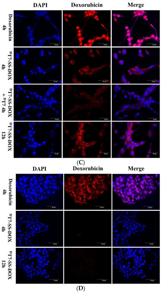 Confocal microscopy images of free DOX (10 µM, 4 h) and DT7-SS-DOX (equivalent DOX concentration of 10 µM, 4 and 12 h) in A549 (A), HepG2 (B), U87 (C), and LO2 (D) cells. For the TfR competitive inhibition assay, cells were pre-incubated with the TfR affinity peptide (100 μM) for 8 h and then treated with DT7-SS-DOX for 4 h. Blue represents the nuclei stained with DAPI, and red represents the fluorescence of DOX. Scale bars: 50 µm.