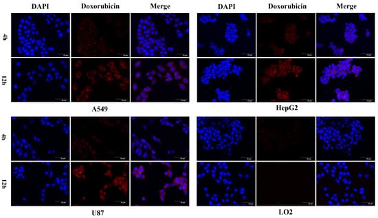 Confocal microscopy images of LT7-SS-DOX (equivalent DOX concentration of 10 µM, 4 and 12 h) in A549, HepG2, U87, and LO2 cells. Blue represents the nuclei stained with DAPI, and red represents the fluorescence of DOX. Scale bars: 50 µm.