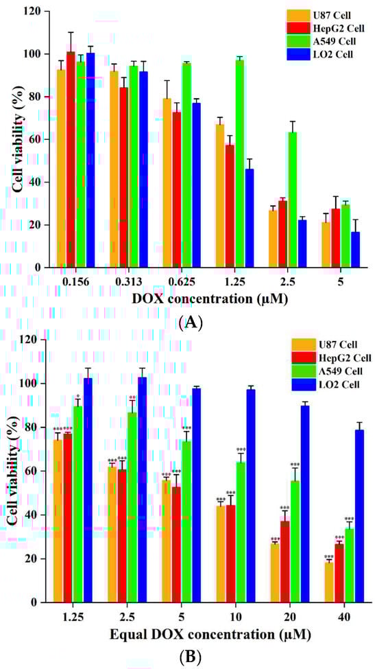 In vitro cytotoxicity of free DOX (A) and DT7-SS-DOX (B) against cells. Data were presented as mean ± SD (n = 3), * p < 0.05; ** p < 0.01 and *** p < 0.001 versus LO2 cells group.