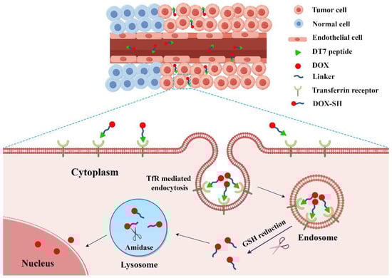 The reason for the stronger antitumor activity of free DOX is possible because this drug can quickly enter into tumor cells via passive diffusion and immediately kill tumor cells in vitro. However, it is supposed that PDCs constructed by forming an amide bond via the amino of DOX may not exert cell proliferation inhibitory activity until free DOX is released. One of the PDCs like this, named cRGD-SS-DOX, released DOX-SH rather than free DOX after co-incubation with B16 mouse melanoma cells for 3 h. Furthermore, the in vitro cytotoxicity of cRGD-SS-DOX against B16 cells was found to be 20.6 times lower than that of free DOX [30]. Similarly, after taken up by tumor cells, we speculated that the peptide–doxorubicin conjugates in our study can exhibit antiproliferative activity only if the disulfide bond is cleaved by GSH to generate DOX-SH, and the subsequent cleavage of the amide bond of DOX-SH by amidases present in lysosomes to release free drug finally occurs, as illustrated in Figure 6. Nevertheless, cellular uptake results of the above PDCs showed that the red fluorescence was still mainly located in the cytoplasm of tumor cells even at an incubation time of 12 h, indicating that the release of free DOX was a slow and time-dependent process, which made the antiproliferative activity of PDCs weaker than that of free DOX. In addition, the stronger antiproliferative activity of DT7-SS-DOX in comparison with that of LT7-SS-DOX was probably related to the higher affinity of DT7-SS-DOX to TfR as well as its sustained drug release behavior in tumor cells.