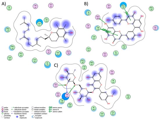 Graphical representation of the interactions between HR1 and (A) alpha-tocotrienol, (B) amentoflavone, and (C) isorhamnetin 3-O-rutinoside.