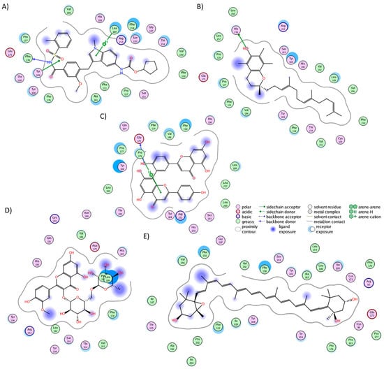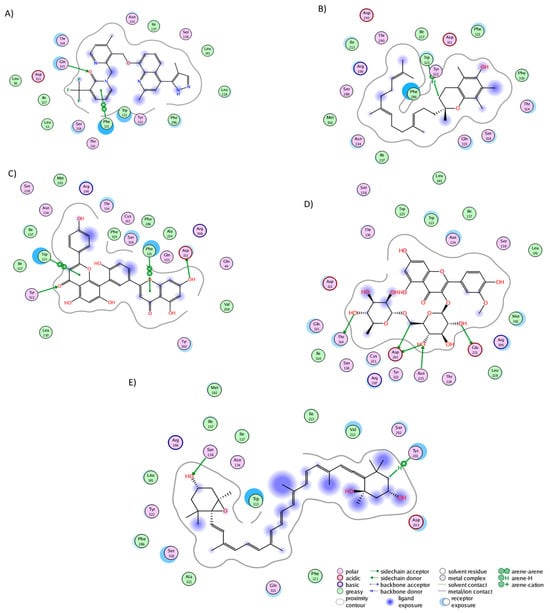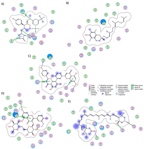 Graphical representation of the interactions of CLR1 in complex with (A) zafirlukast, (B) alpha-tocotrienol, (C) amentoflavone, (D) isorhamnetin-3-O-rutinoside, and (E) neoxanthin.