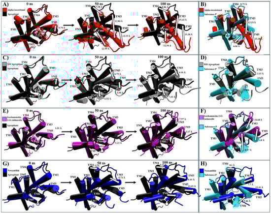 Structural comparison of NKR1 (intracellular view). (A) Alpha-tocotrienol complex dynamics (red) at 0, 50, and 100 ns compared to experimental structure of NKR1/aprepitant (black). (B) Alpha-tocotrienol complex (red) compared to experimental structure of NKR1/substance P (cyan). (C) MD aprepitant complex dynamics (silver) at 0, 50, and 100 ns compared to experimental structure of NKR1/aprepitant (black). (D) MD aprepitant complex (silver) compared to experimental structure of NKR1/substance P (cyan). (E) Isorhamnetin-3-O-rutinoside complex dynamics (purple) at 0, 50, and 100 ns compared to experimental structure of NKR1/aprepitant (black). (F) Isorhamnetin-3-O-rutinoside complex compared to experimental structure of NKR1/substance P (cyan). (G) Neoxanthin Complex dynamics (blue) at 0, 50, and 100 ns compared to experimental structure of NKR1/aprepitant (black). (H) Neoxanthin complex compared to experimental structure of NKR1/substance P (Cyan). Measurements were performed with VMD based on the alpha carbon of TM3’s residue 135, TM4’s residue 144, TM5’s residue 224, and TM6’s residue 242. White arrows illustrate the measurements between TMs.