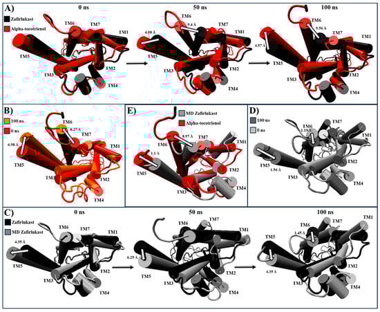 Structural comparison of CLR1 (intracellular view). (A) Alpha-tocotrienol complex dynamics (red) at 0, 50, and 100 ns compared to experimental structure of CLR1/zafirlukast (black). (B) Alpha-tocotrienol complex at 0 ns (red) and 100 ns (orange). (C) MD zafirlukast complex dynamics (silver) at 0, 50, and 100 ns compared to experimental structure of CLR1/zafirlukast (black). (D) Zafirlukast complex at 0 ns (silver) and 100 ns (grey). (E) Alpha-tocotrienol complex (red) compared to MD zafirlukast at 100 ns (silver). Measurements were performed with VMD based on the alpha carbon of TM5’s residue 221 and TM6’s residue 225. White arrows illustrate the measurements between TMs.