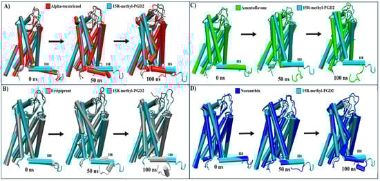 Structural comparison of CRTH2 (intracellular view). (A) Alpha-tocotrienol complex dynamics (red) at 0, 50, and 100 ns compared to experimental structure of CRTH2/15R-methyl-PGD2 (cyan). (B) Fevipiprant complex dynamics (silver) at 0, 50, and 100 ns compared to experimental structure of CRTH2/15R-methyl-PGD2 (cyan). (C) Amentoflavone complex dynamics (green) at 0, 50, and 100 ns compared to experimental structure of CRTH2/15R-methyl-PGD2 (cyan). (D) neoxanthin complex dynamics (blue) at 0, 50, and 100 ns compared to experimental structure of CRTH2/15R-methyl-PGD2 (cyan).