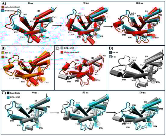 Structural comparison of BK2R (intracellular view). (A) Alpha-tocotrienol complex dynamics (red) at 0, 50, and 100 ns compared to experimental structure of BK2R/bradykinin (cyan) (B) Alpha-tocotrienol complex at 0 ns (red) and 100 ns (orange). (C) JSM-10292 complex dynamics (silver) at 0, 50, and 100 ns compared to experimental structure of BK2R/bradykinin (cyan). (D) JSM-10292 complex at 0 ns (silver) and 100 ns (grey). (E) Alpha-tocotrienol complex (red) compared to JSM-10292 at 100 ns (silver). Measurements were performed with VMD based on the alpha carbon of TM5’s residue 253 and TM6’s residue 266. White arrows illustrate the measurements between TMs.