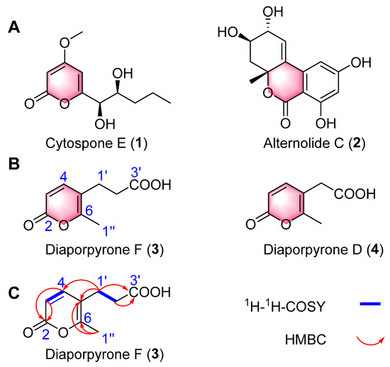(A) Cytospone E (1) isolated from the endophytic fungus Cytospora rhizophorae A761 and alternolide C (2) isolated from the marine-derived fungus Alternaria alternata LW37. (B) Structures of compounds 3–4 isolated from the endophilic fungus Diaporthe sp. CB10100. (C) Key 1H-1H COSY and HMBC correlations of diaporpyrone F (3).