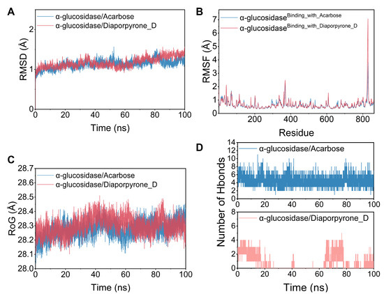 Subsequently, a molecular dynamics simulation was run under physiologically simulated conditions to clarify the binding pattern, stability, and molecular interaction mode of 4 with the α-glucosidase protein complex. Root-mean-square deviation (RMSD), root-mean-square fluctuation (RMSF), and hydrogen bond studies were utilized to investigate the dynamic changes and stability of complex systems. Structural stability is often characterized by low RMSD and RMSF values [18]. As shown in Figure 3A, the RMSD of the two systems, α-glucosidase/acarbose and α-glucosidase/diaporpyrone D (4), are plotted in the RMSD variation graphs during the simulation. The two systems gradually converge in the first 5 ns of the simulation and maintain very stable fluctuations in the subsequent simulations, with the RMSD maintaining fluctuations within 1–2 Å. Based on the stable fluctuations of the two systems, the systems are stable in combination. As shown in Figure 3B, the RMSF of all proteins after binding different small molecules was low, which indicates that the core structure of the proteins has good rigidity. Therefore, these proteins are more rigid as binding small molecules, and these small molecules have an inhibitory effect. Notably, the red line and the blue line have a high degree of superposition, indicating that the two small molecules have similar effects on the proteins. The radius of gyration (RoG) reflects the embodied compactness and can reflect the degree of densification of the system. In Figure 3C, we can observe that α-glucosidase/acarbose and α-glucosidase/diaporpyrone D (4) fluctuate similarly, and both systems exhibit similar binding effects. A detailed analysis revealed that the RoG of α-glucosidase/acarbose was mostly smaller during the simulation, implying that the system became more compact, corresponding to relatively stronger binding.