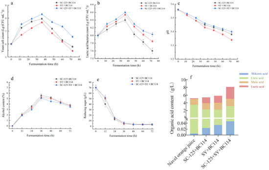 The changes in yeast cell count (a), lactic acid bacteria cell count (b), pH (c), alcohol content (d), and reducing sugars (e) during navel orange wine fermentation, and organic acids (f) in fermented navel orange wine.