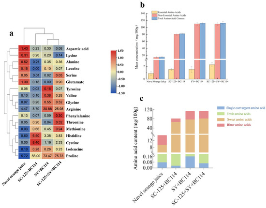 Amino acids, the fundamental building blocks of proteins, also contribute to the unique flavor profiles of foods [14]. The varying levels of amino acids may influence the nutritional value and flavor of fruit wines. The changes in amino acids in the navel orange juice and navel orange wines produced using different fermentation methods are illustrated in Figure 2a. As shown in Figure 2b, after fermentation, the levels of essential amino acids, non-essential amino acids, and the total amino acid content in the navel orange wines increased. Among them, the group with the highest total amino acid content was the S. cerevisiae SC-125 + Angel yeast SY + L. plantarum BC114 group, which also had the highest content of essential amino acids. This indicates that the S. cerevisiae SC-125 + Angel yeast SY + L. plantarum BC114 group possesses higher nutritional value. The group with the highest non-essential amino acid content was the Angel yeast SY + L. plantarum BC114 group. As shown in Figure 2c, it can be observed that the predominant flavor-enhancing amino acids in navel oranges and their wines were sweet-tasting amino acids (serine, threonine, glycine, alanine, proline, valine, methionine, and cysteine), with the highest concentration in the S. cerevisiae SC-125 + Angel yeast SY + L. plantarum BC114 group, followed by the Angel yeast SY + L. plantarum BC114 group, the S. cerevisiae SC-125 + L. plantarum BC114 group, and finally the fresh navel orange juice. Furthermore, in comparison to previous experimental results [3], the sweet amino acid concentration in L. plantarum BC114, at 80.255 mg/100 g, surpasses that in the S. cerevisiae SC-125 + Angel yeast SY79 group, which stood at 79.515 mg/100 g. This suggests that the incorporation of L. plantarum BC114 can modestly heighten the sweetness of navel orange wines. Bitter-tasting amino acids (leucine, isoleucine, and valine) were less abundant than the sweet-tasting ones, and their concentration followed a similar pattern to the sweet-tasting amino acids. The fresh navel orange juice contained the highest amount of umami-tasting amino acids (aspartic acid and glutamic acid), followed by the S. cerevisiae SC-125 + Angel yeast SY + L. plantarum BC114 group.