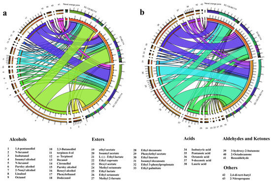 Distribution of 43 key volatile compounds in fermented navel orange fruit wine: (a) alcohols, acids; (b) esters, aldehydes and ketones, and other classes. The width of each bar in the compound’s histogram indicates its proportional distribution in the sample.