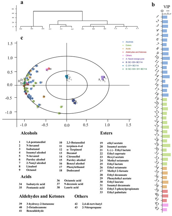 Analysis of volatile compounds in fermented navel orange wine samples using different fermentation methods. (a) Conventional clustering of volatile compounds using the average connection age method. (b) Important variables in predicting (VIP) values for 43 important volatile compounds. (c) The hyperbolic plot of volatile compounds in the orthogonal Partial Least Squares Discriminant Analysis (PLS–DA) model between different samples.