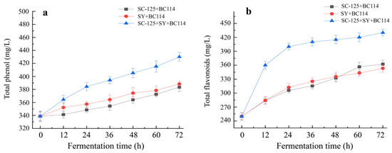 Changes in total phenol (a) and total flavonoid levels (b) during fermentation of navel orange fruit wine.