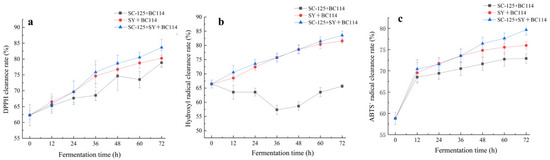 The changes in hydroxyl free radicals during the fermentation process of the navel orange wines are depicted in Figure 6b. The samples fermented with S. cerevisiae SC-125 + Angel yeast SY + L. plantarum BC114 and Angel yeast SY + L. plantarum BC114 exhibited significant increases in hydroxyl free radicals. The hydroxyl free radical scavenging rates after fermentation rose to 83.54% and 81.54%, respectively, which represented an increase of 25.72% and 22.71% compared to pre-fermentation levels. After fermentation, the hydroxyl free radical scavenging rate in the S. cerevisiae SC-125 SY + L. plantarum BC114 sample was 64.55%, showing a 2.94% decrease compared to the control (66.45%). The degradation and oxidation of antioxidant compounds might be the reasons for the reduced hydroxyl free radical scavenging rate, as different strains of fermentation microorganisms have varying abilities to utilize antioxidant compounds [23]. Thus, the increase in hydroxyl free radical scavenging rate in navel orange wines appears to be closely related to the choice of strains during fermentation.
