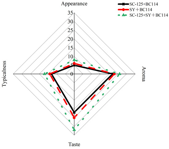 Based on the radar chart in Figure 7, it is evident that there were statistically significant differences in the sensory evaluations of the navel orange wines produced by the different fermentation groups. The navel orange wines fermented with S. cerevisiae SC-125 + Angel yeast SY + L. plantarum BC114 exhibited higher scores in terms of appearance, aroma, taste, and typicality compared to the other groups. Additionally, the sensory evaluation scores of the SY + BC114 group were consistently higher than those of the S. cerevisiae SC-125 + L. plantarum BC114 group. In summary, the flavor of the navel orange wines from all three fermentation groups were perceived as pleasant and harmonious. Among them, the wines fermented with S. cerevisiae SC-125 + Angel yeast SY + L. plantarum BC114 exhibited the most favorable flavor, with a clearer body and distinct typical characteristics in terms of taste and appearance.