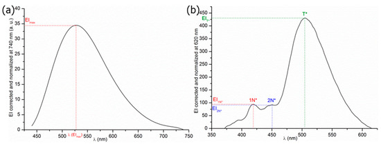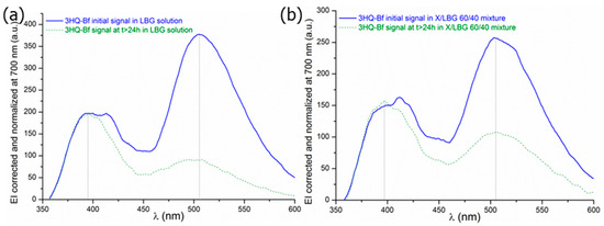 As established above, in the present work, the 3HQ-Bf fluorescence signal remains usable for a total polymer concentration up to 0.2% (w/w) without disturbing the dye ratiometry property. At the beginning, 3HQ-Bf was only a molecule synthesized to specifically evidence hydrogen bonding; thus, using it in aqueous polymeric systems made it necessary to check several parameters. To this end, additional experiments to analyze 3HQ-Bf probe sensitivity to dipole-dipole interactions were envisaged with the aim to check whether the wavelengths (λ1N*, λ2N*, and λT*) of the three specific bands 1N*, 2N*, and T* are subject to shifts or not. For this purpose, sets of scans were acquired for different X/LBG mixture ratios at t = 0 and at t > 24 h to minimize the irradiation time exposure. In order to keep the results clear, only the results corresponding to the LBG solution and X/LBG 60/40 mixture are reported in Figure 6a and Figure 6b, respectively. As clearly visible on both figures, there is a significant decrease in EI, especially for the T* spectral band between t0 and t > 24 h, thus clearly proving that the hydrogen bond network did change. No significant wavelength shifts (vertical black dotted lines) occured over time, meaning that the medium polarity did not change as previously suggested by Bilokin’ and co-workers [33]. These results undoubtedly prove that data acquisition related to 3HQ-Bf probe relies only upon the 1N* band, since the 2N* band is never observed in our case (Figure 6); hence, EI1N* appeared much more reliable and was therefore chosen to calculate the ratio IEN*/EIT*. Thus, the results exposed in the present paper only consider results based on the 1N* band.