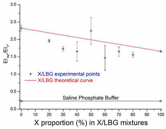 Figure 7 represents the evolution of EI1N*/EIT* measured for different X/LBG ratios, including pure X and LBG polysaccharide solutions, for a total polymer concentration of 0.2%. This allows for the observation that whatever the polymer solutions and mixtures, the hydrogen bond network is more developed compared to the solvent alone (saline phosphate buffer). This result is consistent with polysaccharidic molecules that have numerous hydroxyl groups and are thus favorable to the occurrence of hydrogen bonds [47,48,53]. Nevertheless, the hydrogen bond network appears more intense for solutions or mixtures enriched with LBG solution compared to X solution; this result may be explained by different factors: in particular, both xanthan rigidity [54] and polyelectrolyte character are obviously against the establishment of polymer–polymer intra- and inter-molecular interactions. On the other hand, LBG’s flexibility [55] and neutral character may clearly favor molecular interactions through hydrogen bonding.