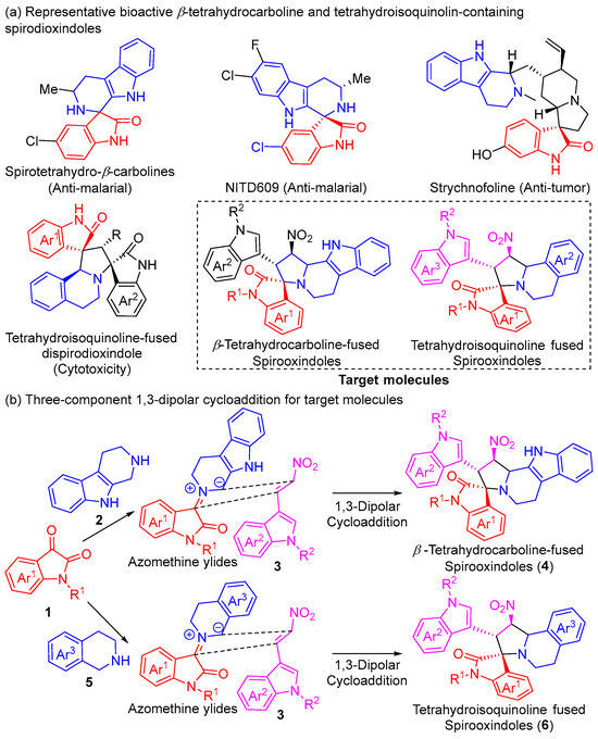 The polycyclic indole skeleton belongs to a prominent heterocycle, containing a spiro- or fused- indole motif, and plays an important role in organic synthesis, phytochemistry, and drug discovery [1,2,3,4,5]. As two representative subgroups of polycyclic indoles, β-tetrahydrocarboline and tetrahydroisoquinoline containing spirooxindoles belong to representative heterocyclic scaffolds. Respectively, β-tetrahydrocarboline features a fusion of indole and piperidine ring [6,7,8], and spirooxindole bears a spiro-framework at the 3-position of the oxindole core [9,10,11,12], accompanied by versatile tetrahydroisoquinoline [13,14,15], which are considered the important pharmacophores related to anti-malarial, anti-tumor, and anti-bacterial activities, among others [16,17,18,19]. Constantly, two or more skeleton-units are accommodated in a unique natural or synthetic pharmacologically active compound, which recognized as a drug design strategy via combining multiple molecule-cores to potentialize its biological activities [20,21,22]. β-Tetrahydrocarboline- and tetrahydroisoquinoline-fused spirooxindoles, all of which integrate the characteristic unit, are prevalent in natural alkaloids and synthetic pharmaceutical molecules (Scheme 1a). Bifunctionalized spirotetrahydro-β-carboline has been identified as providing promising therapeutic leads with antimalarial activity [23]. NITD609 is a promising candidate for the treatment of malaria and human cancer [24,25]. Strychnofoline, isolated from the leaves of Strychnos usambarensis, displays high antimitotic activity against cultures of mice melanoma and Ehrlich tumor cells [26]. Tetrahydroisoquinoline-fused dispirodioxindoles have been proven to be related to cytotoxicity [27]. Hence, there is an enormous demand to achieve functionalized polycyclic indoles, particularly those β-tetrahydrocarboline- and tetrahydroisoquinoline-fused spirooxindoles by combining bioactive β-tetrahydrocarboline and tetrahydroisoquinoline with spirooxindole, which could be valuable for discovering new bioactive compounds.
