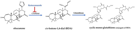 The co-incubation of obacunone with human liver microsomes (LMs) showed that the reduction, hydroxylation, and glycation reactions at the C-7 and C-16 sites are the main metabolic pathways of obacunone [103]. In the NADPH-added microsomal incubation system, obacunone was first metabolized to cis-butene-1,4-dial (BDA), which was then captured by glutathione, N-acetylcysteine, and N-acetyllysine to generate 13 metabolites. Among these metabolites, the cyclic mono-glutathione conjugate of BDA was the predominant metabolite, which was also detected in the bile and urine after obacunone administration in rats (10 mg/kg, i.v.). The generation pathway of the main metabolites is illustrated in Figure 3. The intermolecular reactions of GSH and BDA intermediates of the adducts generated four bis-GSH-BDA adducts, which could be found in rat bile. In addition, obacunone can be NADPH-independent and directly pass through the Michael receptor (α,β-unsaturated carbonyl group) without activation to obtain obacunone-derived GSH adducts excreted through bile with GSH, which can further adduct with acetylcysteine (NAC) to form NAC conjugates excreted in the urine [104]. Recombinant enzyme and ketoconazole inhibition experiment showed that CYP3A4 is the key enzyme responsible for the metabolic conversion of obacunone.