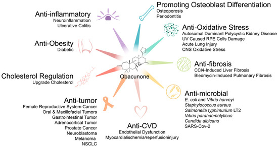 Obacunone has received increasing attention owing to its pharmacological properties. Zheng et al. have published a narrative review of the relevant research on obacunone [13]. However, due to the rapid progress in research, especially in the exploration of deeper mechanisms in anticancer, anti-inflammatory, anti-oxidative stress and anti-fibrosis activities, their effects on bone metabolism, the regulation of cholesterol metabolism, and actions against anti-pathogenic microorganisms, especially their potential efficacy against coronavirus disease 2019 (COVID-19) viruses, previous literature did not include new findings. Therefore, this review provides a more detailed and comprehensive updated summary of the pharmacological and pharmacokinetic progress of obacunone. The findings discussed in this review will expand our understanding of obacunone and help facilitate its development and clinical applications.