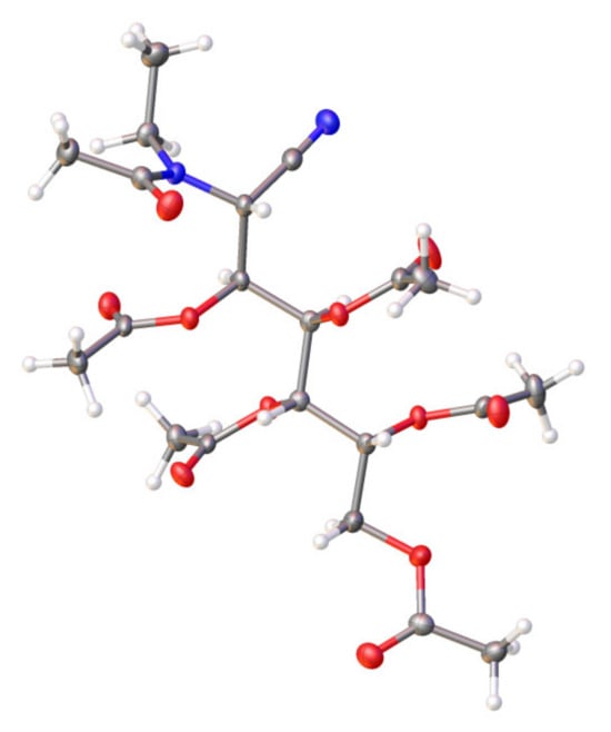 Compound 47 shows a [M + H]+ peak at m/z 387.1406, in agreement with the molecular mass of 386.1325 for C16H22N2O9. For compounds 47 and 51, the NH absorption band of the secondary amide group appears at 3237 cm−1, with the first and second amide bands occurring at 1645 and 1541 cm−1, respectively. The stretching vibration of the C≡N group, generated by oxime dehydration, is hardly visible at ~2243 cm−1; however, the band is moderately intense in the Raman spectrum (also at 2243 cm−1). The 1H NMR spectra confirm likewise the structures of 47 and 51, and thus the NH signal appears as a doublet at ~6.7 ppm. In the 13C NMR spectra, the carbon signals of the acetamido group are clearly distinguishable from those of the acetate groups: for example, in the case of 47, such resonances appear at ~172 ppm and at ~22.9 ppm. As expected, the C≡N group resonates at ~116 ppm. Lastly, the unequivocal structure of compound 47 could be established with X-ray diffractometry (Figure 9) and shows the presence of the C≡N and acetamido groups at C-2.