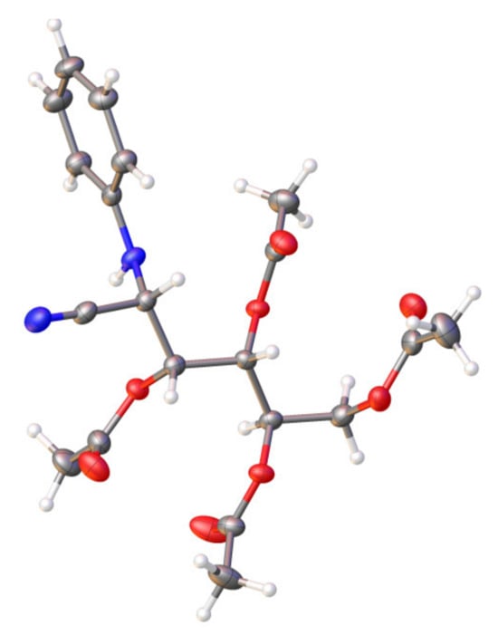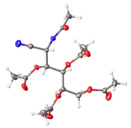 The determination of the molecular masses of 11 [52] and 13 [50] was performed by recording their HRMS (CI mode), which showed [M + H]+ and [M + NH4]+ peaks. Values of m/z = 415.1706 for 11 (C18H26N2O9, MW 414.1638) and m/z = 487.1904 (C21H30N2O11, MW 486.1850) for 13 were obtained. The spectroscopic data of compounds 11 and 13 are closely similar. Their IR spectra show typical absorptions of acetate and tertiary amide at ~1750 cm−1 and ~1650 cm−1, respectively [69]. The absorption bands of the C≡N group are very weak, but they are moderately intense in the corresponding Raman spectra. Signal integration and carbon counting in the 1H and 13C NMR spectra show the presence of five acetyl groups for 11 and 12, and six for 13 (four or five acetate groups and one acetamido group, respectively). The presence of a signal at ~115 ppm shows the presence of the C≡N group [81,82]. Finally, the structure of 13 could conclusively be demonstrated using single-crystal X-ray diffraction (Figure 1).