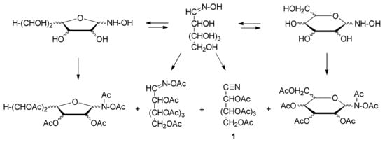 On the other hand, peracylated aldononitriles (1) have been extensively studied with gas chromatography coupled to mass spectrometry [17,18,19,20,21,22,23,24,25,26] and used in various quantitative analyses of sugar and aminosugar mixtures [27,28,29,30,31,32,33,34,35,36,37,38]. Derivatization usually involves a base-catalyzed acetylation of the corresponding aldose oxime with acetic anhydride. The use of such derivatives provides some advantages over other sugar derivatives, mainly because it was believed that a single compound preserving the overall stereochemistry of the starting sugar is produced. However, the formation of significant amounts of peracetylated acyclic and cyclic oximes, both in furanoid and pyranoid structures, has raised questions regarding the quality of the method (Scheme 1) [39].