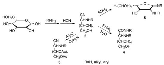 Also, the dehydration of per-O-acetylaldonamides leads to per-O-acetylaldononitriles [41], just like the radical fragmentation of sugar-derived β-hydroxy azides [42]. Conformational studies aided by molecular mechanics were conducted on peracylated aldononitriles, with the ultimate goal of performing a full stereochemistry elucidation of the aldose moiety starting from NMR spectroscopy [43,44,45]. In contrast, few data are available for 2-amino-2-desoxyaldononitriles (2) and their acyl derivatives (3). More recently, mass spectrometry of amino sugar aldononitrile acetate derivatives was used for isotope enrichment assessment of microbial residues in soil [35]. 2-Amino-2-deoxyaldononitriles and their N-alkyl and N-aryl derivatives are intermediates in the aminonitrile synthesis of 2-amino and 2-alkylamino-2-deoxyaldoses [46,47,48,49,50,51,52,53,54,55,56], and they are generally obtained by reacting an aldose with excess of ammonia or an amine in anhydrous methanol/ethanol with subsequent addition of anhydrous hydrogen cyanide. However, unexpected by-products like aminoamides 4 and iminolactones 5 are sometimes obtained (Scheme 2) [57,58,59,60].