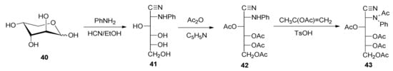 However, the phenylamino group could be acetylated by heating 42 at reflux in isopropenyl acetate and using p-toluenesulfonic acid as catalyst, thereby obtaining 3,4,5,6-tetra-O-acetyl-2-(N-phenylacetamido)-2-deoxy-d-glucononitrile (43) in a high yield (82%). As a model compound, tetra-O-acetyl-2-acetamido-2-deoxy-d-glucononitrile (47) was also prepared through the dehydration under acetylating conditions of 2-amino-2-deoxy-d-glucose oxime (45), using a modification of the Restelli-Deulofeu method [61] (Scheme 4).