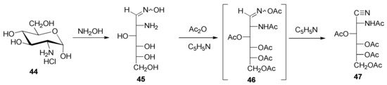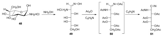 Analogously, penta-O-acetyl-2-acetamido-2-deoxy-d-glycero-l-gluco-heptononitrile (51) was generated through an oxime (49), which derives from 2-amino-2-deoxy-α-d-glycero-l-gluco-heptopyranose hydrochloride (48) [67] as a starting material (Scheme 5). It is worth pointing out that the amide character of the nitrogen atom at C-2 in both 47 and 51 prevents further acylation, at least under the conditions tested.