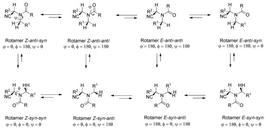 Scheme 7 (R = Me, R1 = Ph) shows the possible rotamers for the benzyl and tertiary acetamido groups [107], along with a visual description of the φ, ϕ, and ψ angles for conformational analyses. The amide-group stereochemistry of 37 in the solid state (Figure 3) is Z-syn-anti (φ = 0, ϕ = 0, ψ = 180), but the chemical shift of H-2 indicates that the most stable rotamer in the solution must be the Z-anti-syn (φ = 0, ϕ = 180, ψ = 0) conformer [107], since this is the disposition that generates less steric hindrance, being the only one actually detected in both the 1H and 13C NMR spectra.