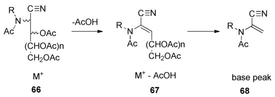Electron impact mass spectrometry provides valuable structural information on peracyl aminonitriles, which is usually lost in chemical ionization experiments. Accordingly, fragmentation patterns of some compounds were interrogated through EI-MS. In general, the [M+] peak is weak or does not appear at all for the per-O-acetyl-2-alkylacetamido-2-deoxyaldononitrile ion (66), while the second peak, appearing always, corresponds to the loss of acetic acid, [M+ − AcOH] (67), and then the fragmentation into the corresponding α,β-unsaturated 2-N-alkylacetamidonitrile (68), which is usually the basis peak (Scheme 8).