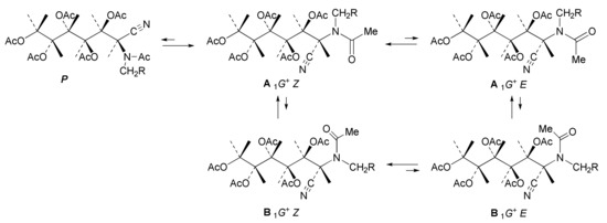 The 1H NMR spectrum of 38 is more complex than that of 37, and shows a duplicity of signals (Figure 4). This duplicity does not result from an epimeric nitrile at C-2, having a d-glycero-l-manno configuration, since its synthesis took place from pure 33. Initially, we thought of a mixture of two acetylated nitriles, i.e., both acylated and not acylated at the nitrogen atom. However, after successive trials and conducting the acetylation procedure at different temperatures or in the presence of sodium acetate or using 4-dimethylaminopyridine, the latter being known as an efficient nucleophilic catalyst in the acetylation of sterically hindered positions [104,105,106], no changes occurred. In addition, chromatographic analysis showed a single compound. We reasoned that the signal duplication should most likely be ascribed to a mixture of rotamers around the amide bond. Overall, the spectral patterns are similar to those observed for 37, nevertheless.