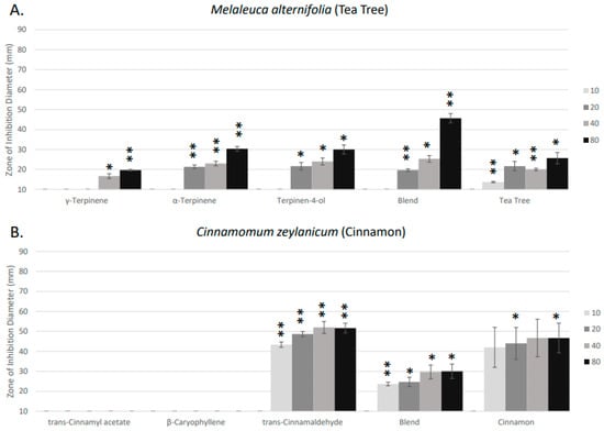 Based on our previous studies, Streptococcus pyogenes served as the model organism to assess the antimicrobial activity of specific aromatic constituents from rosemary, cinnamon, thyme, tea tree, and wintergreen essential oils in incremental amounts. In previous research and repeated here, rosemary, cinnamon, thyme, and tea tree were effective against S. pyogenes, while lemon and wintergreen were ineffective [14] (Figure 1). Rosemary and thyme EO showed a dose-dependent increase in the zone of inhibition with thyme reaching a maximal zone of inhibition from 20 to 80 µL/mL. For thyme, a larger zone of inhibition was observed for the 40 µL/mL dose compared to the 80 µL/mL dose, but this difference was not statistically significant and was likely due to experimental variation (Figure 1 and Figure 2). For cinnamon EO, only a minor dose dependence in the zone of inhibition was observed. This may be due to a limitation on how far the active constituents can diffuse into the air from the cylinder. This research further validates the activity of the aromatic constituents present in these essential oils against the model organism, S. pyogenes.