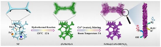 Li et al. prepared FeSO4·7H2O and Na2MoO4·2H2O solutions as metal precursors, then the as-obtained solution and a piece of Ni foam were transferred to an autoclave with a Teflon liner [31]. The reaction was kept at 120 °C for 24 h to synthesize FeMo dual-site catalysts (FeMo@CoNi-OH/Ni3S2), as shown in Figure 2. The electrocatalytic performance of FeMo@CoNi-OH/Ni3S2 was then investigated in both acidic and alkaline solutions. It exhibited excellent HER performance with 89 and 177 mV to reach 10 mA cm−2 in 1 M KOH and 0.5 M H2SO4, respectively, indicating it is more favorable for HER compared with the other contrast samples. The successful synthesis of Fe and Mo single atoms can provide atomic sites, and the difference in electronegativity between Fe and Mo led to charge rearrangement and a charge compensation effect, thus improving the electrochemical performance.