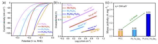 Electrochemical HER performance in 1.0 M KOH. (a) Linear sweep voltammetry curves of Ni3Se2, Mo/Ni3Se2, Pt1/Ni3Se2, Pt1Mo1/Ni3Se2, and Pt/C. (b) Tafel slope curves. (c) Comparison of mass activity for Pt1/Ni3Se2, Pt1Mo1/Ni3Se2, and Pt/C. Reproduced with permission [68]. Copyright 2023 Wiley-VCH GmbH.