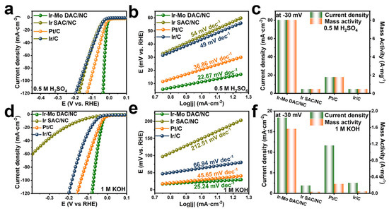 DACs can achieve effective HER across a wide pH span, outperforming the performance of Pt/C. Qu and co-workers prepared N-coordinated Ir-Mo DAC on a carbon matrix [71]. The as-prepared Ir-Mo DAC/NC has an overpotential of 11.3 mV at 10 mA cm−2 in 0.5 M H2SO4, surpassing that of Ir/C and Pt/C (Figure 6a). In this environment, it also achieves a low Tafel slope of 22.67 mV dec−1 (Figure 6b). The mass activity of Ir-Mo DAC/NC surpasses the commercial Pt/C and Ir/C catalysts in acidic electrolytes, as displayed in Figure 6c. The HER activity of Ir-Mo DAC/NC was further evaluated in 1 M KOH (Figure 6d–f) to investigate its pH universality. It has an overpotential of 23 mV to deliver a current density of 10 mA cm2 with a corresponding Tafel slope of 25.24 mV dec−1 and a mass activity of 1569 mA/mgIr, all of which are better than the commercial Ir/C and Pt/C. DFT calculations indicate that the electronic synergy between Ir and Mo modulates the interaction between the intermediates and active sites, arising outstanding electrochemical performance.