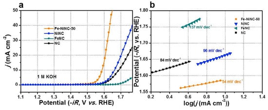 (a) LSV for the catalysts in 1 M KOH. (b) Tafel plots of the catalysts in 1 M KOH. Reproduced with permission [81]. Copyright 2020 Elsevier B.V.